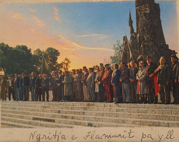 Fotografia e dytë, e realizuar pas ngritjes së flamurit, reflekton shpërthimin e një gëzimi të përmbajtur, por të thellë. Mitingu përpara Monumentit të Pavarësisë nuk ka shenjat e një organizimi rigid shtetëror; përkundrazi, ai duket si një tubim i lindur natyrshëm nga nevoja për të ndarë një emocion kolektiv. Këndimi i Himnit të Flamurit nga vetë pjesëmarrësit, pa bandë muzikore, i jep kësaj pamjeje një autenticitet të rrallë: zëri i popullit zëvendëson protokollin, ndërsa ndjenja kombëtare shprehet drejtpërdrejt, pa ndërmjetës.