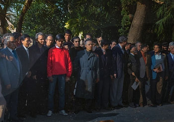 fotografinë e parë, çasti para ngritjes së flamurit, ndjehet një tension solemn dhe një përqendrim emocional i jashtëzakonshëm. Nuk është thjesht pritja e një akti ceremonial, por pritja e një momenti që do të rishkruajë marrëdhënien e shqiptarëve me simbolin e tyre më të shenjtë. Prania e ish-të përndjekurve politikë në rreshtin e parë, krahas familjarëve të djaloshit që do të ngrinte flamurin, i jep fotos një dimension etik dhe historik të thellë: aty qëndrojnë njerëz që për dekada ishin përjashtuar nga historia zyrtare, por që tani bëhen protagonistë të saj. Vetë fizionomitë, qëndrimet trupore dhe veshjet e thjeshta dëshmojnë sinqeritetin e ngjarjes dhe largësinë e saj nga çdo lloj skenografie të imponuar.