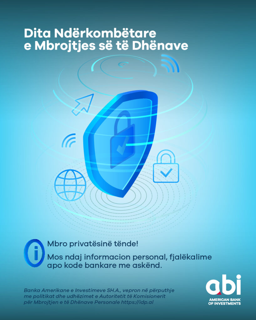 Në kuadër të Ditës Ndërkombëtare të Mbrojtjes së të Dhënave, ABI Bank vjen me dy këshilla të thjeshta për të gjithë ju që dëshironi të mbroni privatësinë dhe sigurinë e të dhënave tuaja personale. Ruajtja e informacionit është thelbësore për një përvojë bankare të sigurt dhe të besueshme, ndaj ju ftojmë të tregoni kujdes dhe përgjegjësi në çdo veprim.