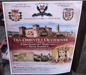 Manifesti i kuvendit historiko-kulturor “Tra oriente e occidente – Ndërmjet perëndimit dhe lindjes”, dedikuar markezes Maria Arianiti Brankoviç Paleologa, aktivitet i organizuar më 27 shkurt 2026, në sallën e Bibliotekës Komunale “Giovanni Canna” në Monferrato.