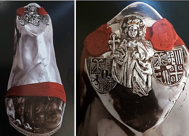 Relike e këmbës të Shen Margherita e Antiokia, e derdhur në argjend, në Muzeun e Duomo në Monferrato Casale, me Shen Margeritën ndërmjet stemës heraldike të Maries dhe stemës të Maries dhe Bonifaci III.